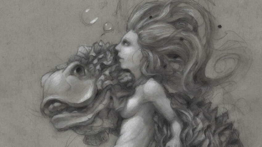 Dieses Motiv habe ich schon vor zwei Jahren versucht anzugehen in einer meiner Zeichnungen und nun hier die Neuauflage. Hier wollte ich mich ganz auf die Dynamik und den Fluss konzentrieren. Der Versuch war, eine natürliche Bewegung zu zeichnen, in der sich die Formen gegenseitig so natürlich wie möglich ergänzen. Es sollte die Verbindung zwischen Mensch und Kreatur zeigen, ohne dass die Individualität der Wesen dabei verloren geht.